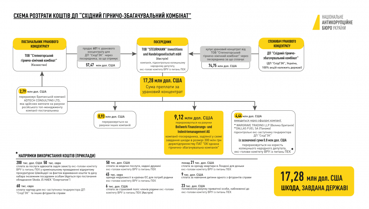 Детективы НАБУ установили, что Мартыненко причастен к разворовыванию средств украинского уранодобывающего госпредприятия "Восточный ГОК" на сумму 17,28 млн долларов. По версии следствия, в 2014-2016 годах "Восточный ГОК" закупил 601 тыс. тонн уранового концентрата у казахского предприятия "Степногорский ГХК", но не напрямую, а через посредника. Им стала австрийская компания STEUERMANN Investitions und Handelsgesellschaft mbH, которая, по информации НАБУ, подконтрольна Николаю Мартыненко. В Антикоррупционном бюро уточняют, что компания-посредник отпускала урановый концентрат для "Восточного ГОКа" по завышенной цене: если изначальная цена казахского предприятия составляла 57,47 млн долларов, то после проведения сделки через австрийскую компанию, эта сумма возросла до 74,75 млн долларов. По версии следствия, почти 3 млн долларов из более 17 млн долларов переплаты было возвращено ввиде "отката" казахскому предприятию и около 1 млн долларов было направлено "на счета других компаний".