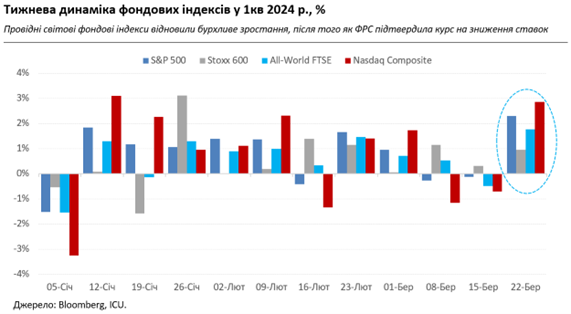 Недавно ускорение февральской инфляции в США огорчило рынки облигаций и несколько насторожило рынки акций. Однако, как оказалось, по этому поводу не очень переживает ФРС, или по крайней мере делает вид. На прошлой неделе (18-22 марта) состоялось очередное заседание американского центрального банка, на котором было решено оставить ставки неизменными, как и ожидали рынки. Более того, регулятор подтвердил свой предварительный прогноз общего снижения ставок на 75 базовых пунктов в этом году. Именно по поводу возможного изменения этого прогноза были наибольшие опасения.