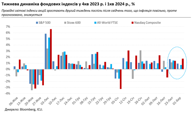 Это также демонстрируют финансовые отчеты компаний. Сезон отчетности за четвертый квартал 2023 года близится к завершению. Согласно данным FactSet, в настоящее время доходы более 70% компаний, входящих в S&P 500, превзошли ожидания аналитиков. Это вместе с верой в яркие перспективы ИИ продолжает толкать вверх индексы акций. Тот же S&P 500 на прошлой неделе (26 февраля – 1 марта) снова обновил рекорд и вырос за неделю еще на 0,9% выше отметки 5137. Аналитики улучшают свои прогнозы индекса на конец года, однако, похоже, за ростом индекса пока еще не успевают: консенсус-прогноз экспертов, опрошенных Bloomberg, на конец года составляет 5000.